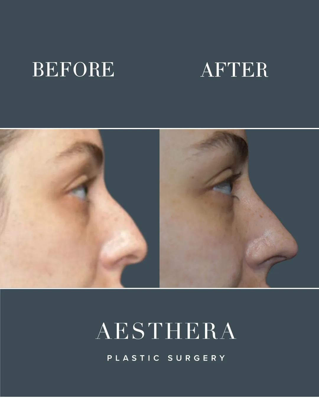 The recovery period after surgical rhinoplasty typically lasts around 1-2 weeks. Patients may experience swelling, bruising, and mild discomfort during this time. Aesthera recommends taking a week off from work or school to rest and allow the body to heal. Often it takes six months to a year to see final results. Regarding non-surgical rhinoplasty, there is usually no downtime.